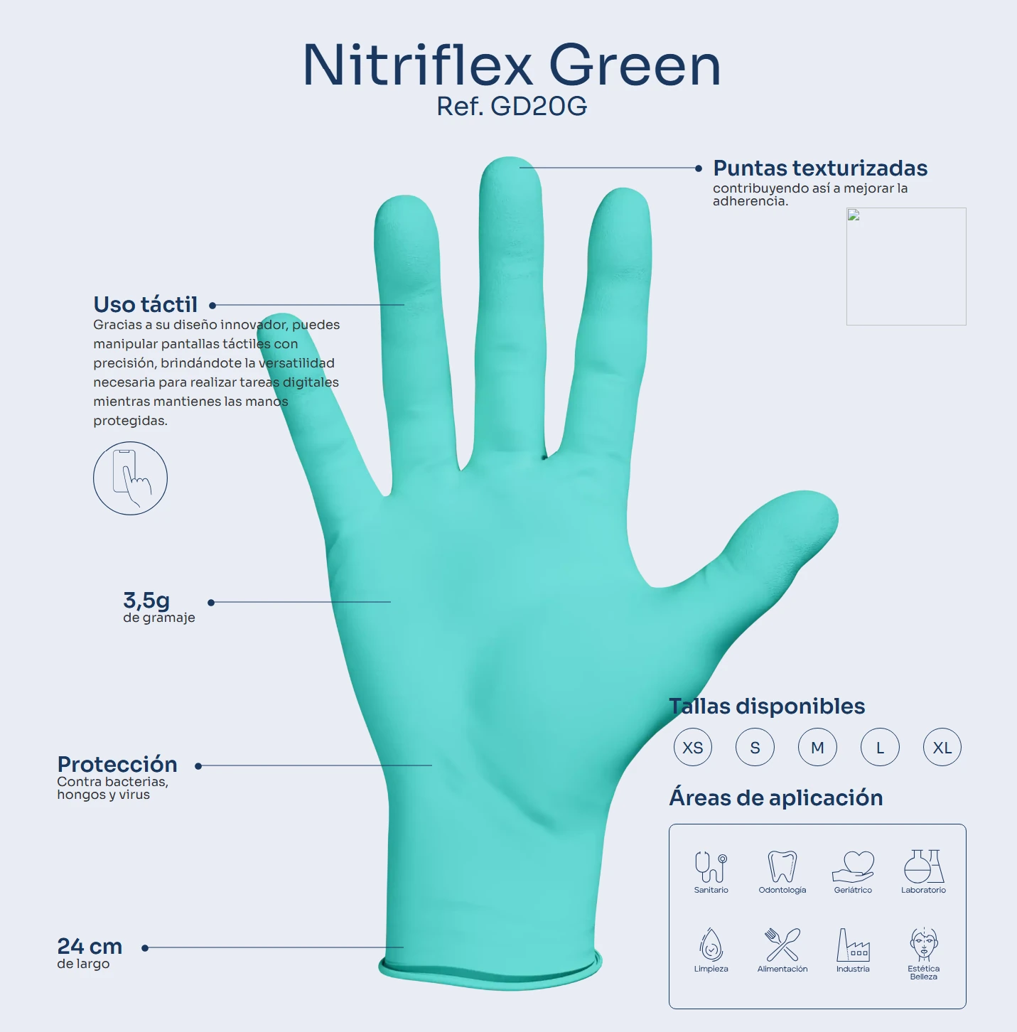 Finos y extra sensibles al tacto debido a que el área de los dedos está texturizada para un mayor agarre tanto en húmedo como en seco.